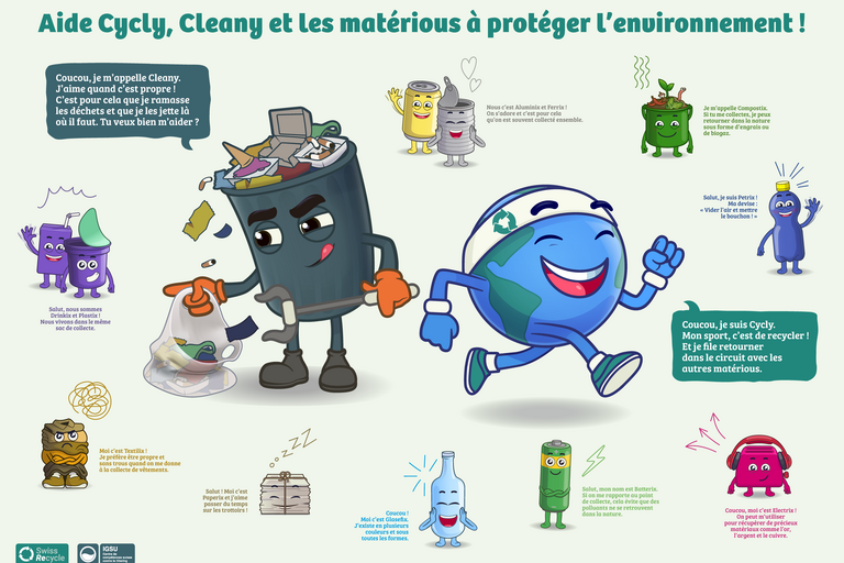 Les personnages Cleany (héros anti-littering) et Cycly (héros de l'économie circulaire) accompagnent les enfants tout au long de l'aventure des déchets. Les deux héros sont accompagnés des petits matérious : chaque personnage représente un matériau recyclable.